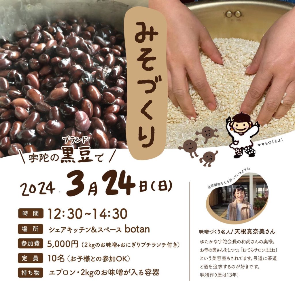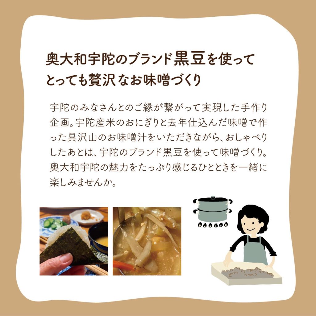 ふるシェアを主宰されている小田切聡さんにご縁を繋いで頂いた大阪阿倍野にあるシェアキッチンのbotanさんで宇陀で作った黒豆を用いたみそづくりが行われました。