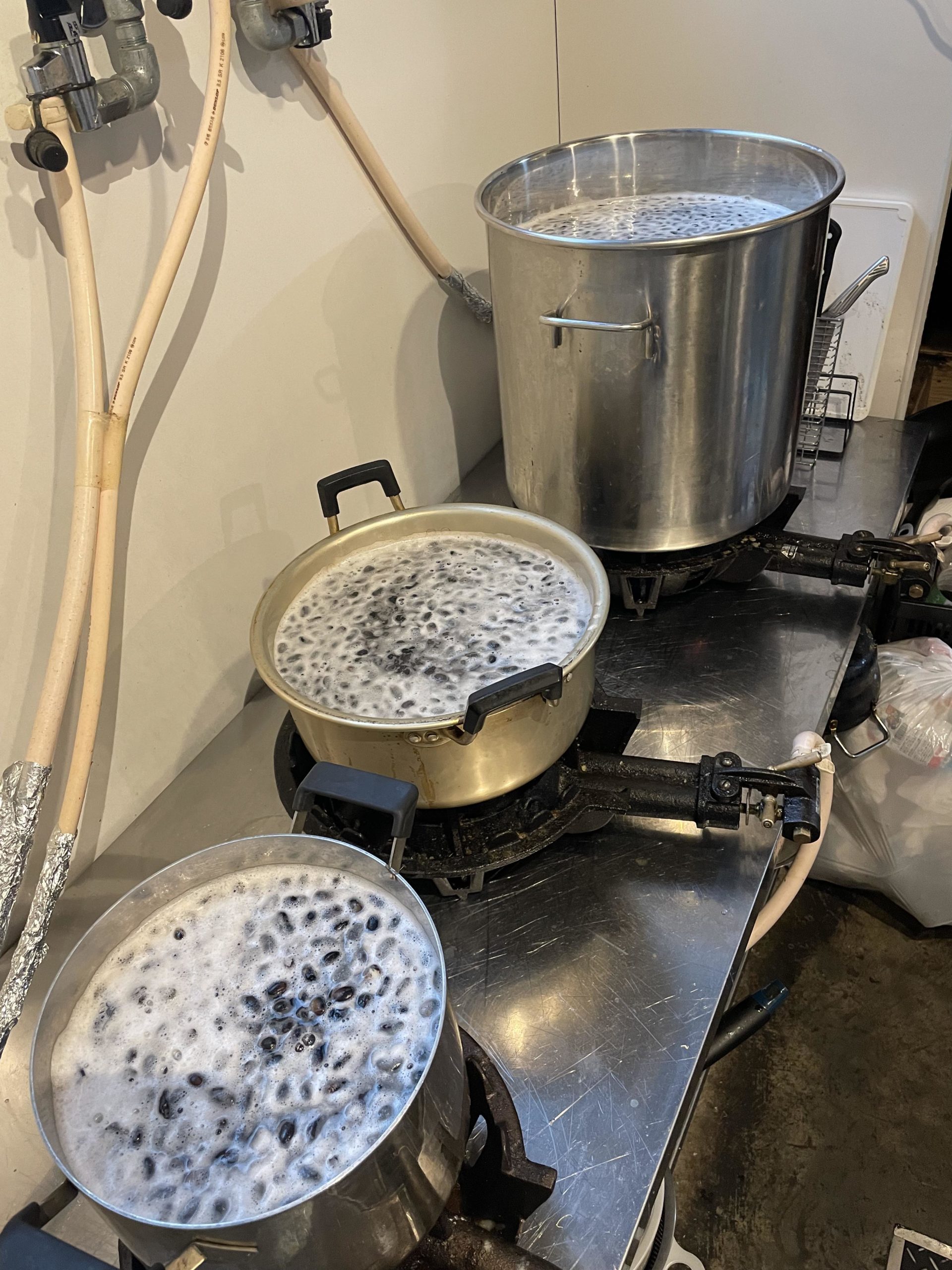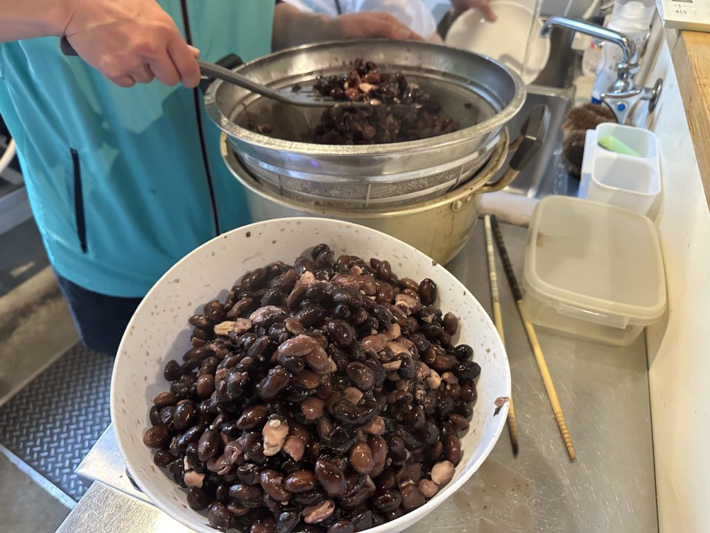 日曜に開催だったので金曜の夕方からお水に豆を漬けてもらって、土曜日の夕方に一度火を通して頂きました。指でつまんで崩れるくらいまでコツコツと炊いてもらいます。3時間半~4時間かかります。