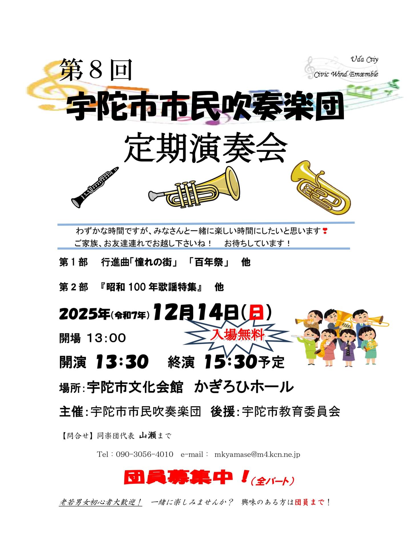 2025/12/14(日)13:30~15:30【大宇陀・宇陀市文化会館】宇陀市市民吹奏楽団第8回定期演奏会