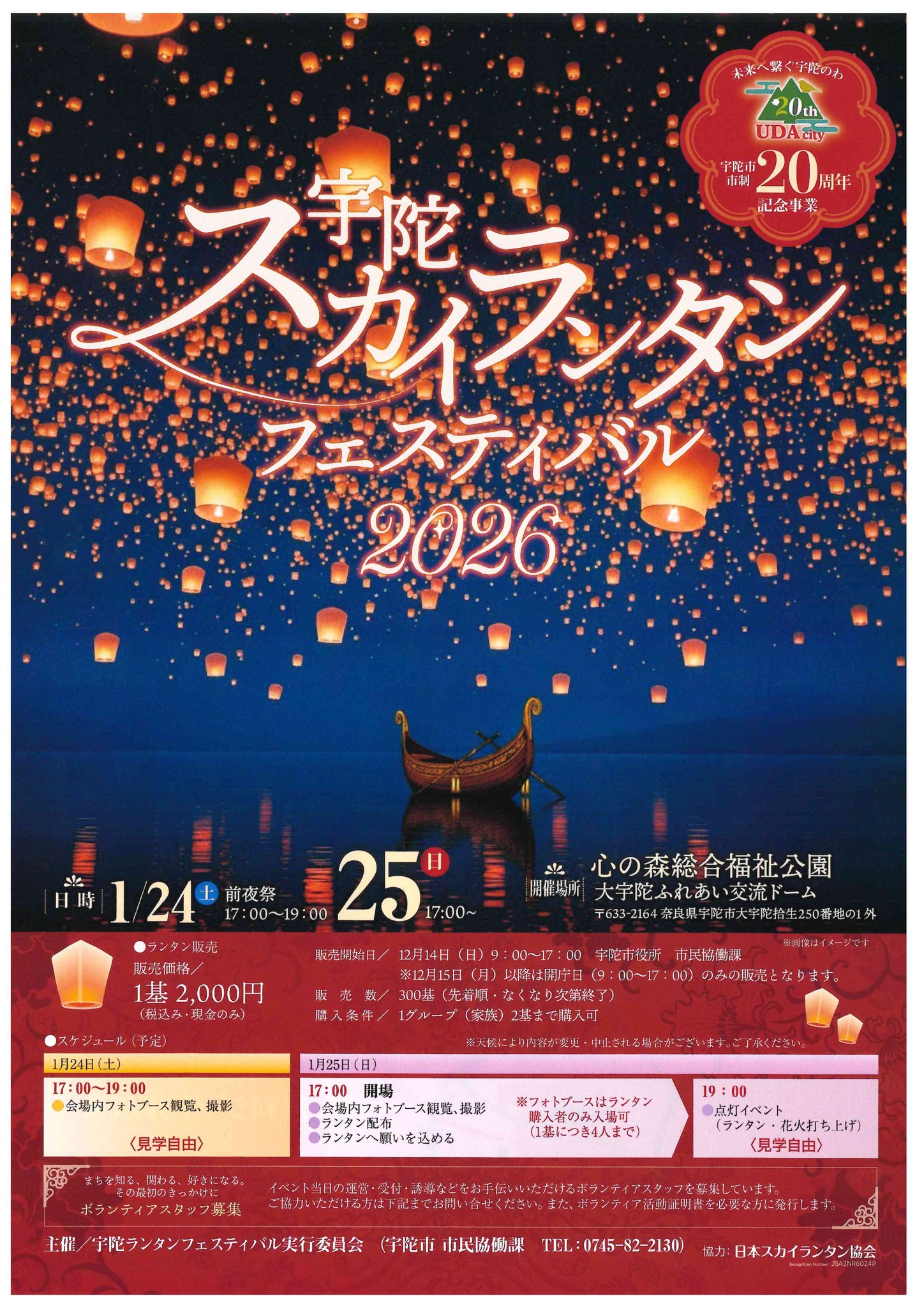 2026 1月 2026/01/24(土),25(日)17:00【大宇陀・大宇陀ふれあい交流ドーム】宇陀スカイランタンフェスティバル 2006(平成18)年に合併して誕生した宇陀市は、 2026年に市制20周年の節目を迎えます。 宇陀スカイランタンフェスティバル2026は、 光を灯したランタンに、 幅広い世代の方、それぞれの「想い」や「願い」を込めて一斉に夜空へ放ち、 幻想的な空間を楽しんでいただくイベントです。 市制20周年を祝うとともに感動を多くの人と共有し、 この先語り継がれるイベントにしたいと思っています。 ぜひ、ご来場ください。 時間 17:00 日時 2026年1月25日(日)17:00~(点灯イベント19:00~) (前夜祭:2026年1月24日(土)17:00~) 場所 ふれあい交流ドーム(宇陀市大宇陀拾生467) ランタン販売 2000円(税込み・現金のみ) 販売場所・期間 2025/12/14~ 宇陀市役所市民協働課 販売数 300基(1グループ2基まで) Post イベント一覧