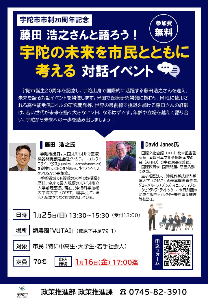 宇陀出身で世界で活躍する藤田浩之さんを迎え、未来について語り合う対話イベントを開催します。
